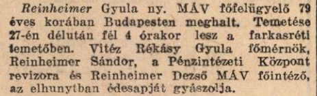 Reinheimer Gyula 1939. január 24-én elhunyt tüdőgyulladásban. A fővárosi Farkasréti temetőben helyezték örök nyugalmra.