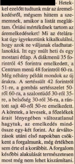 1977 augusztus közepétől vezette be az étteremben az olcsó, előfizetéses vacsora szolgáltatást is elhordásra.