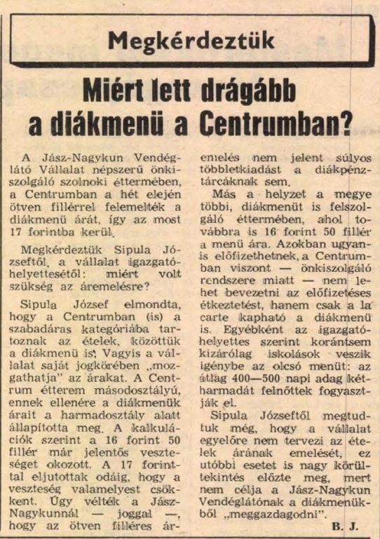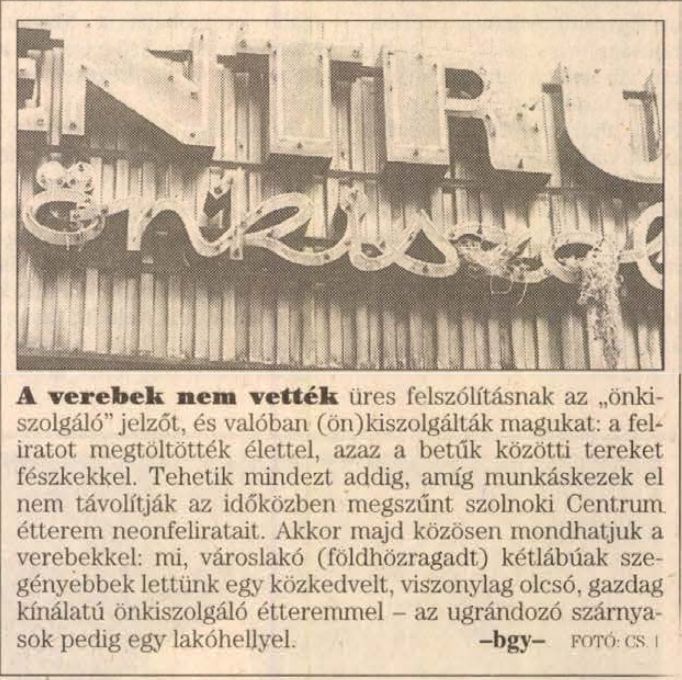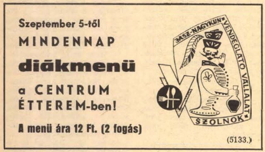 A Jász-Nagykun Vendéglátó Vállalat nyitotta meg új önkiszolgáló éttermét a Vásárcsarnok mellett az 1977. július 18-án. Az önkiszolgáló rendszer lényege: a vendég a belépéskor egy számlalapot kapott, amelyre az adott kiszolgáló részen ráírták az ételek, italok árát és a távozáskor az ajtó melletti pénztárban kellett fizetni.