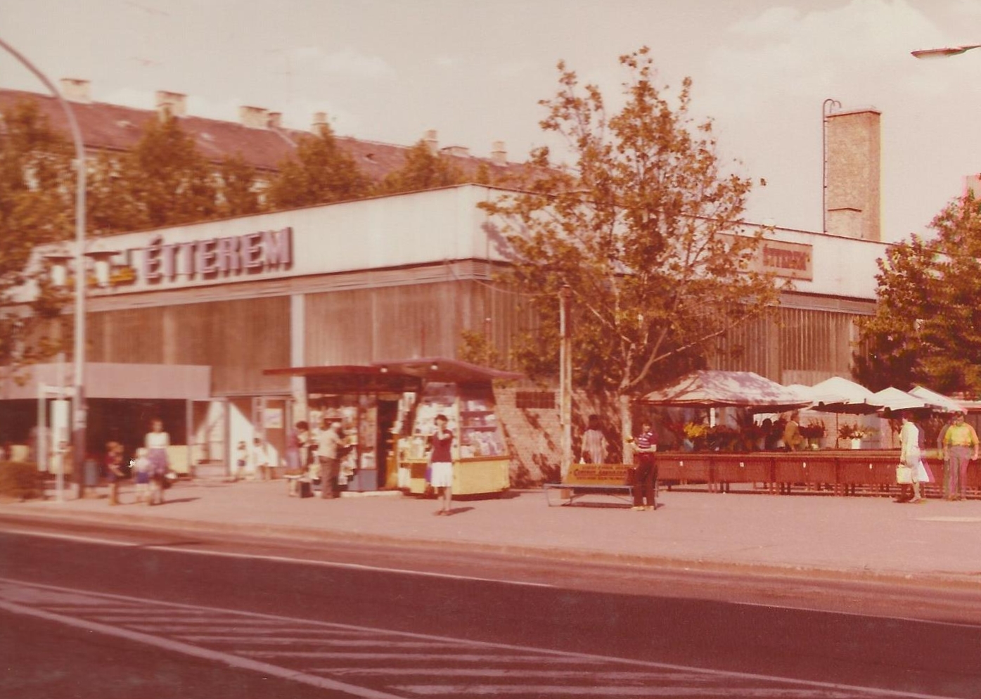 Az étterem az 1980-as évek elején. Homlokzaton olvasható neon feliraot a megyei Építő, Javító és Szolgáltató Vállalat szakemberei készítették. - A fotó Dombi Gábor gyűjteményéből