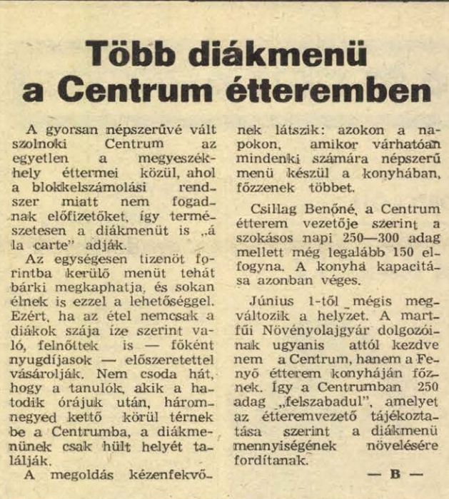 A vállalat kísérletképpen először Szolnokon, a Centrum étteremben árusított diákmenüt, amely rövid időn belül népszerűvé vált.