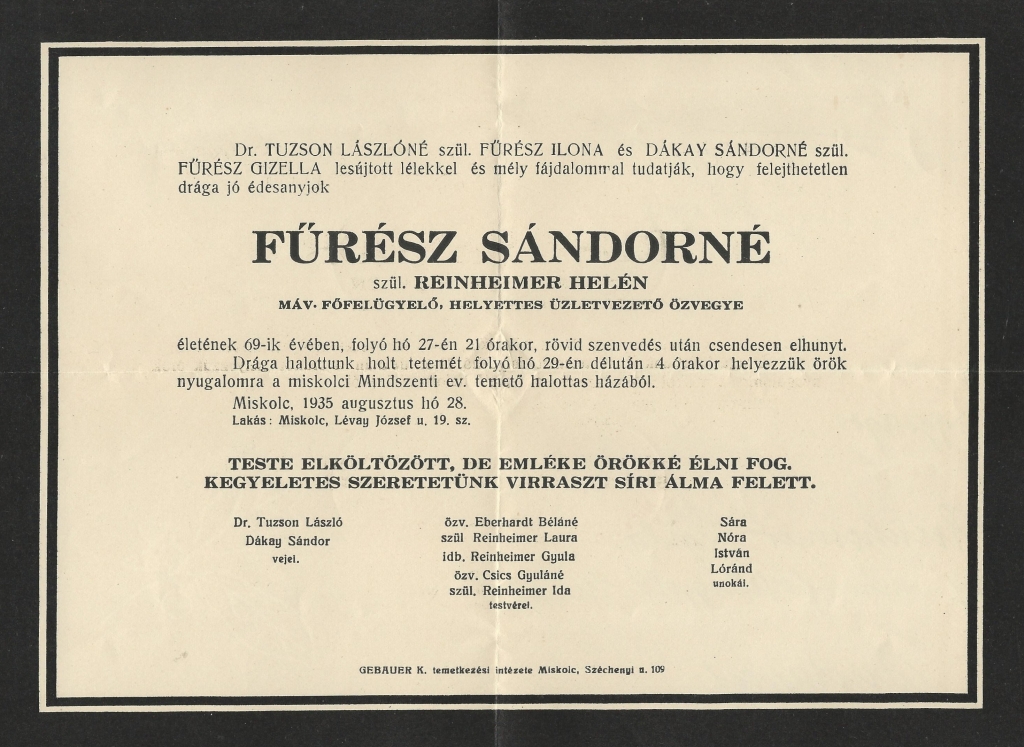 Férje 1825 decemberében hunyt el Budapesten. Özvegye 1935. augusztus 27-én távozott. Miskolcon helyezték örök nyugalomra.
