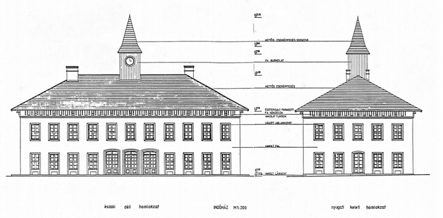A szolnoki Indóház rekonstruált homlokzati rajza. 1989. MERMÜ