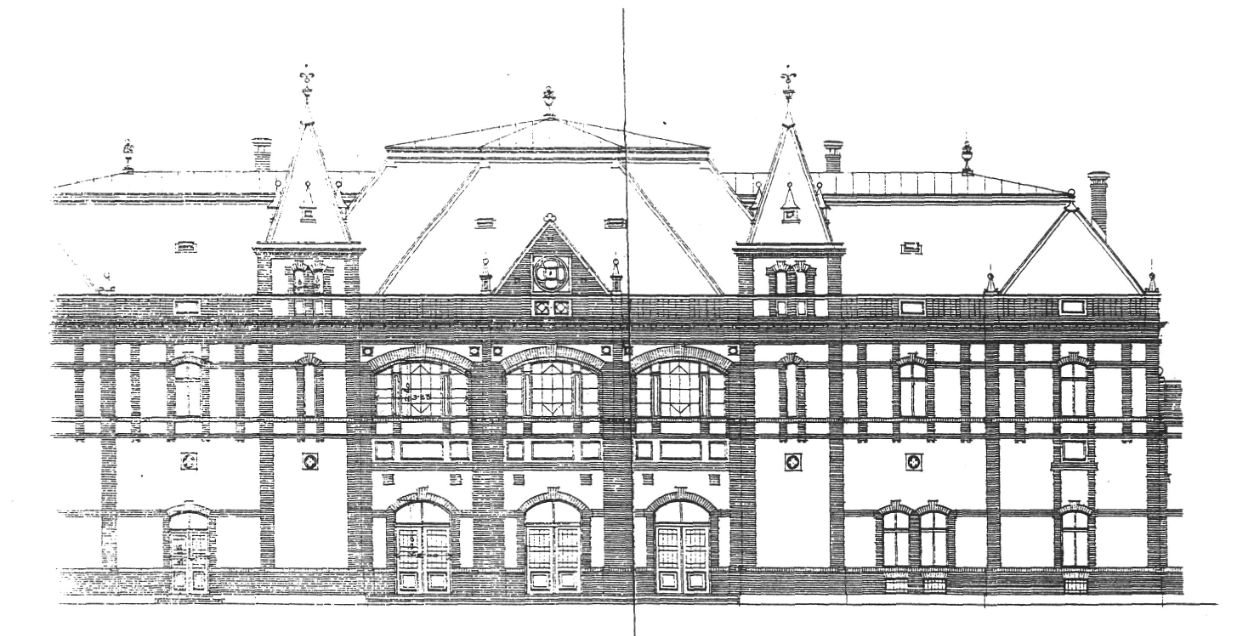 A vágány felőli kidolgozás gazdagabb mint az utcai. A 85 m hosszú veranda nem kísérte végig az épületet, hanem annak csak feléig ért. Ezen az oldalon 9 ablak tengelyes kompozíció volt, a hármas tömegtagozódás következtében a megszokott oldalsó kiegészítésekkel. A homlokzat vakolt, világos falfelületeit oszlopok és lizénák, párkányok egészítették ki.